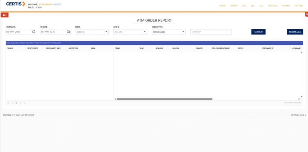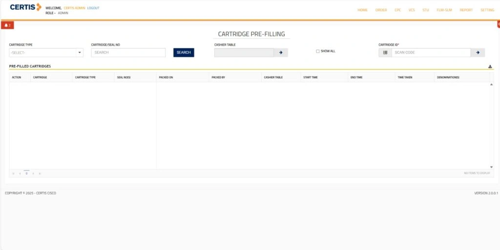 The Certis platform provides a centralized and intelligent solution for streamlining ATM cartridge management and order tracking. By offering a web-based interface, it enables Admin users to efficiently manage pre-filled ATM cartridges through advanced search and filter options, including Cartridge Type, Seal Number, Cartridge ID, and more—alongside a convenient scanning feature and “Show All” functionality. The system is structured to display comprehensive cartridge details such as packing data, timestamps, denominations, and seal numbers, ensuring transparency and accuracy.