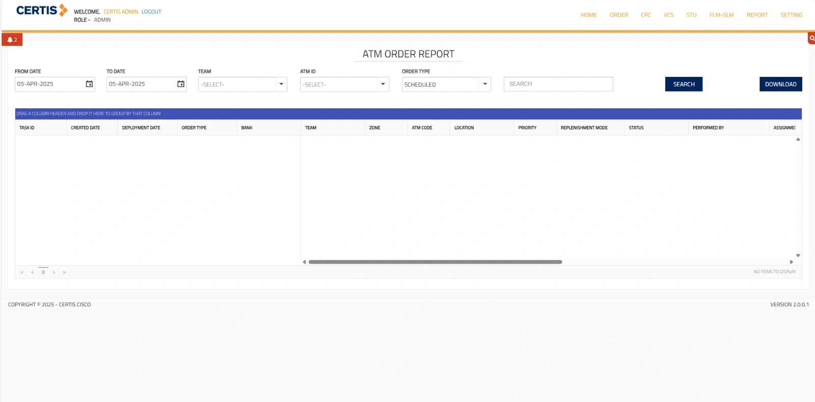The Certis Cisco web interface helps manage ATM cartridge pre-filling. Admin users can search and manage cartridge details using filters like Cartridge Type, Seal Number, Cashier Table, and Cartridge ID (with a scanning option). A “Show All” checkbox lets users view all entries. The Pre-Filled Cartridges section (currently empty) shows details like seal numbers, packing info, timestamps, and denominations. The ATM Order Report interface helps track ATM orders, with filters by date, team, ATM ID, and order type. Admins can search or download data, with the results table (currently empty) showing key details like Task ID, Deployment Date, Bank, Team, Location, Priority, Status, and Assigned Personnel.