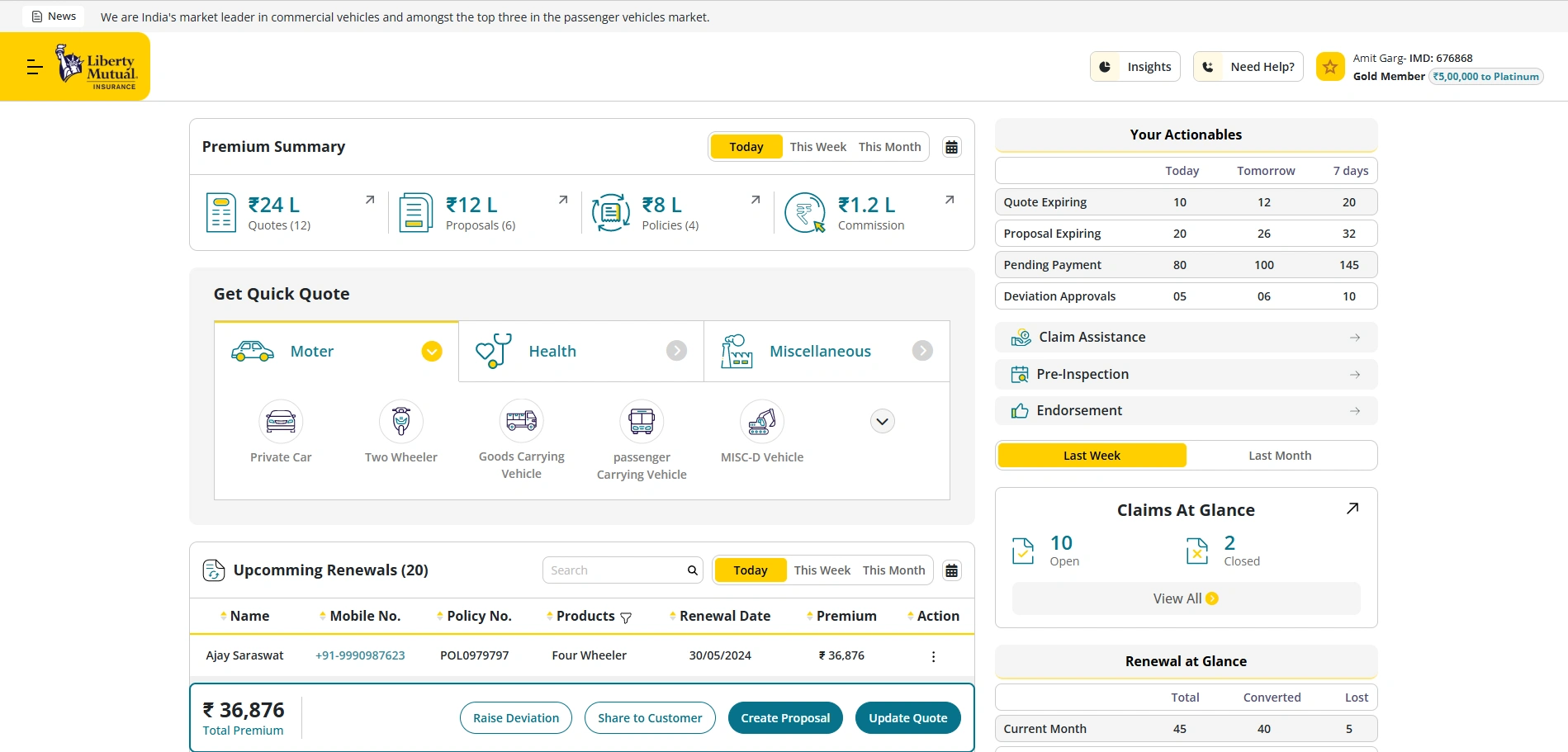 Liberty Mutual Insurance project is an all-inclusive insurance management application with policy management, quote generation, claims follow-up, renewals, and commission computation features.Liberty Insurance project is an internet-based insurance management application that assists agents and customers in managing several insurance related operations effectively. The dashboard offers a view of premium summaries, which include quotes, proposals, policies, and commissions.